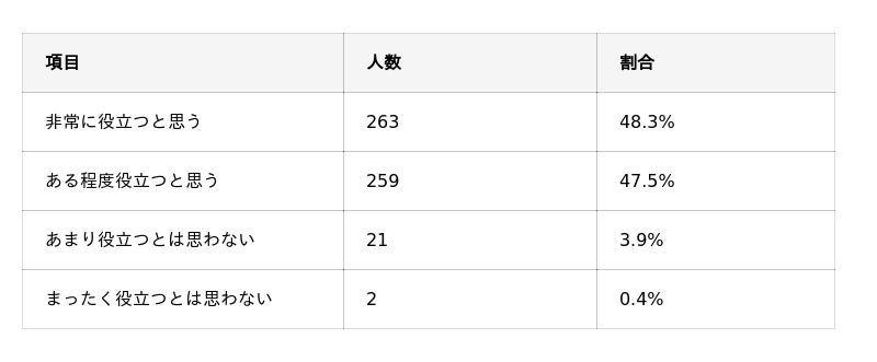 本調査の結果から、サステナビリティや社会課題に関する学びや経験は、将来のキャリア形成において高い有用性が認識されていることが明らかになりました。「非常に役立つと思う」(48.3%)と「ある程度役立つと思う」(47.5%)を合わせると、約96%が役立つと回答しており、ほぼすべての学生がその意義を肯定的に捉えています。一方で、「役立たない」とする回答はごくわずかにとどまり、サステナビリティに関する学びが、幅広い学生にとって有意義なものとして受け止められていることがうかがえます。(表7)表7:サステナビリティや社会課題に関する学び・経験は役立つと思うか n=545