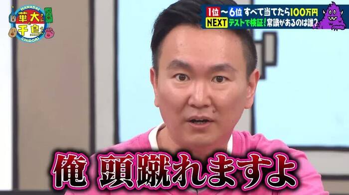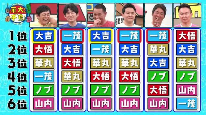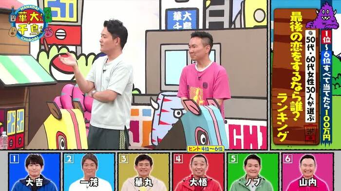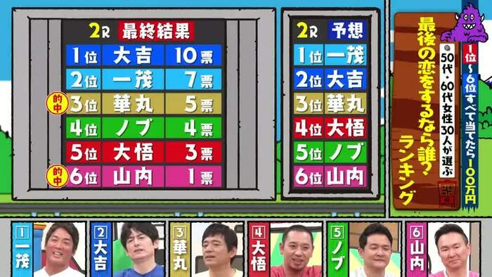 博多華丸さん、博多大吉さん、千鳥(大悟さん、ノブさん)、かまいたち(山内健司さん、濱家隆一さん)を含めた7人のうち、6人がランキングに参加し、3つのお題に対して全員で順位を予想。見事当たれば100万円をゲットできます。