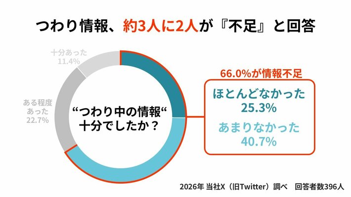 X(旧Twitter)上で実施した参考調査では、66.0%が「つわりに関する情報が十分ではなかった」と回答しました(N=396、SNS調査のため統計的代表性には限界があります)。つわりは多くの妊婦が経験する症状ですが、その苦しさは社会の中で十分に理解されてきませんでした。