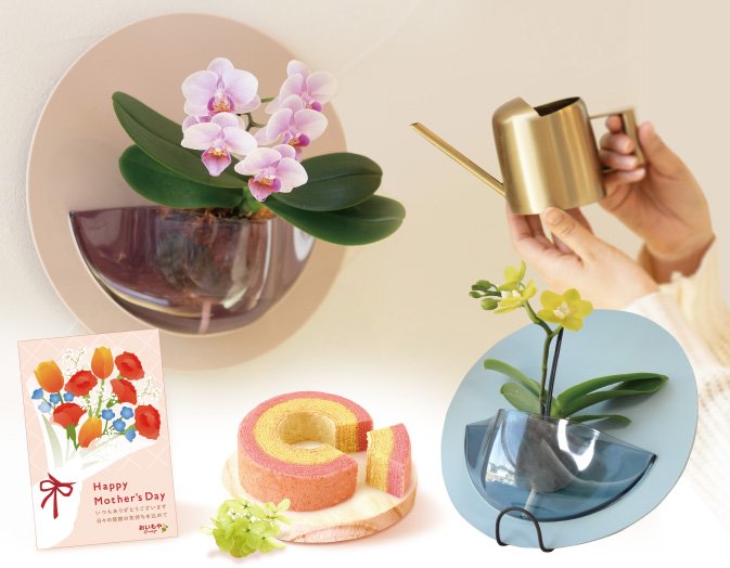ミディ胡蝶蘭「HALO」は直径20cmのパネルに胡蝶蘭専用の水受けがセットされています。コンパクトで飾りやすいサイズ感に加え、パネルのやわらかな色合いと丸いフォルムが上品な印象を与え、母の日の贈り物としても取り入れやすい胡蝶蘭です。壁掛けとスタンドの2WAYで楽しめる仕様とすることで、限られたスペースでも飾りやすく、インテリアとしても取り入れやすい設計となっています。