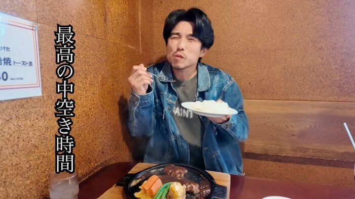 散歩の後は、ご飯を食べにハンバーグ店を訪れた中尾さん。最初に出てきたコンソメスープはとってもおいしかったようで、「毎日飲める」とスプーンを口に運ぶ手が止まりません。