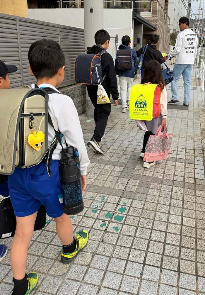 そんな こうめちゃんは「毎朝 数人で登校していますが 女子1人 護衛が多い!」と、お兄ちゃんや友だちに囲まれながら登校しているようですが、その様子を見た小原さんは「大きい人も混じっている!」とコメント。