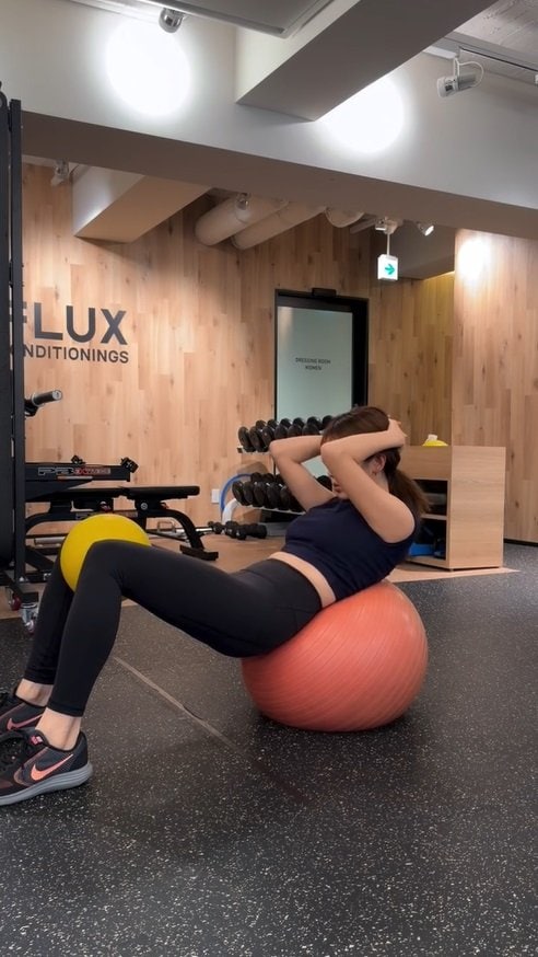バランスボールに背中を置いた腹筋運動など、下腹部を集中的に刺激。両脚の間に小さなボールを挟んで負荷を高めており、質の高いトレーニングをこなしているようです。