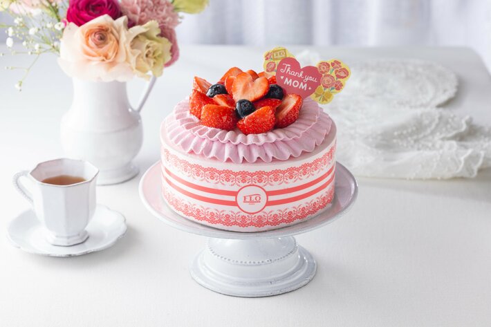 フレッシュな苺を、淡いピンク色のシャンティクリームとふわふわのスポンジでサンドしました。カーネーションの花をイメージして彩り鮮やかに仕上げた、母の日だけのスペシャルなホールケーキ。