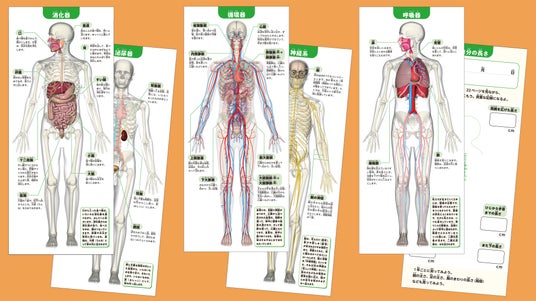 3枚(表裏全6種)の器官系シートを、ひっかけて人体白地図パネルを着せかえ。シートの解説を読むことで、神経系や循環器など、体全体のつながりを学べます。自分の写真をはれる「自分の長さ」シートもあるので、いっしょに並べて楽しめます。