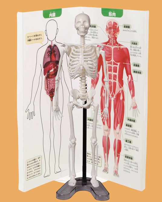 高さおよそ30cm、成人の約1/6サイズの人体骨格模型を組み立てて学べるキット。リアルな模型をパズルのように組み立てるうちに、体のつくりがよくわかります。骨格模型だけでなく、「人体白地図パネル」やパネルにはる「内臓シール」、パネルを着せかえられる「器官系シート」もついて、骨と筋肉や内臓の位置関係もしっかりと学ぶことができます。パイプにさして立たせたり、ぶら下げたり、座らせたりできるので自由に飾れて、小学生から大人まで楽しめます。