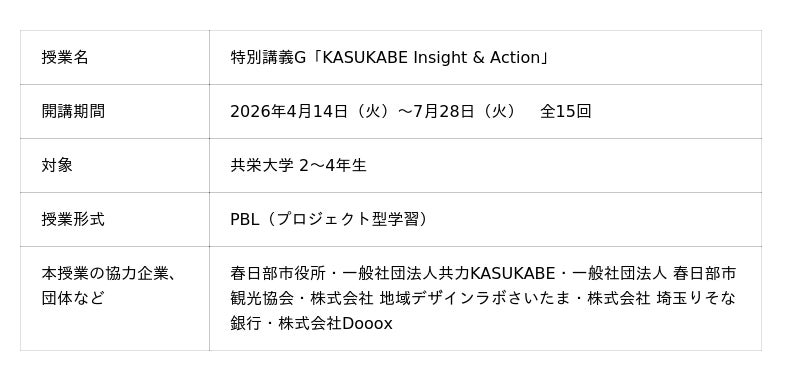 『緊急ではないけれど、重要な課題』について、企業経営者に伴走する特命社長室(R)︎を展開する株式会社Dooox(本社:東京都品川区、代表:久保寺亮介/以下「当社」)は、共栄大学(埼玉県春日部市、学長:平林 信隆)、春日部市、一般社団法人共力KASUKABE、一般社団法人 春日部市観光協会、株式会社 地域デザインラボさいたま、株式会社 埼玉りそな銀行と共同で、特別講義「KASUKABE Insight & Action」を共栄大学の2~4年生を対象とした正規科目として開講します。2026年4月14日(火)に第1回ガイダンスを実施し、前期15回のプログラムが正式に始動しました。本授業の最大の特徴は、春日部市役所の各部署担当者・地元企業経営者・金融機関という「産官学金」の四者が登壇し、学生チームが最終回(7月)に春日部市長・副市長を前に政策提言を行う点です。地域課題の発見から政策提言まで一貫して実社会と接続したPBL(プロジェクト型学習)は、春日部市内初の取り組みです。