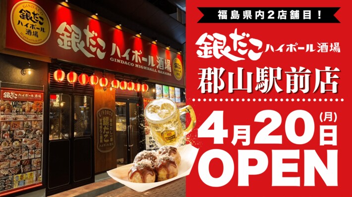 築地銀だこ を展開する 株式会社ホットランドホールディングス (本社:東京都中央区、代表取締役社長:佐瀬守男)の連結子会社で、「銀だこハイボール酒場」や「おでん屋たけし」などの酒場事業を展開する 株式会社オールウェイズ (本社:東京都中央区、代表取締役社長:内田善行)は、2026年4月20日(月)福島県郡山市に『銀だこハイボール酒場 郡山駅前店』 をオープンいたします。