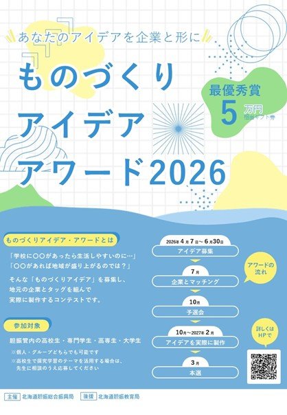 北海道胆振総合振興局では、胆振地域の特色であるものづくり産業への理解を深めてもらうため、管内の学生・生徒を対象に「ものづくりアイデア」を募集し、企業とともに実際に形にするコンテストを実施します。