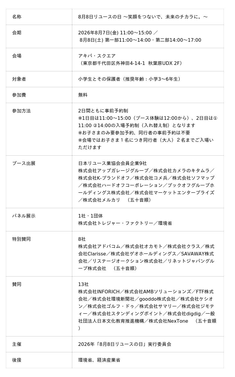 ブックオフグループホールディングス株式会社(本社:神奈川県相模原市、代表取締役社長:堀内 康隆、以下、ブックオフ)は実行委員会の一員として、リユースの日である8月8日を契機としたリユース人口拡大を目的に、小学生とその保護者を対象としたリユース体験イベント「8月8日リユースの日 ~笑顔をつないで、未来のチカラに。~」を2026年8月7日(金)・8日(土)の2日間、東京都千代田区 アキバ・スクエアにて開催いたします。環境省と経済産業省の後援を受け、4月時点で合計31社が賛同。イベントと各社の事業を通じリユースについて考えるきっかけを創出することで、意識せずともしていた選択が循環型社会に繋がることやリユースに対する認識を深め行動へと促すことを目指してまいります。本日2026年4月15日(水)よりイベントの参加申し込みを開始いたします。