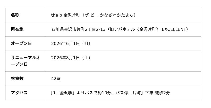 「the b hotels(ザ ビー ホテルズ)」を運営する株式会社イシン・ホテルズ・グループ(本社:東京都港区)は、2026年6月1日(月)、石川県金沢市にthe b hotelsとして15施設目、かつ北陸地方初進出となる「the b 金沢片町」をオープンすることをお知らせいたします。