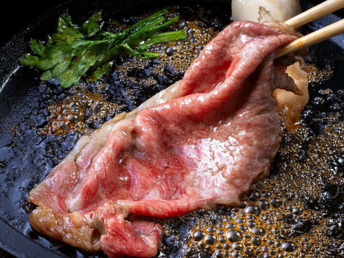昴会席の一品としてご用意する「黒毛和牛すきやき」は、目の前で一枚ずつ丁寧に焼き上げる、臨場感あふれる演出でお楽しみいただけます。鍋の上でやさしく焼き色をまとった黒毛和牛は、香ばしい香りとともに仕上げられ、最も美しい瞬間に合わせてご用意いたします。
