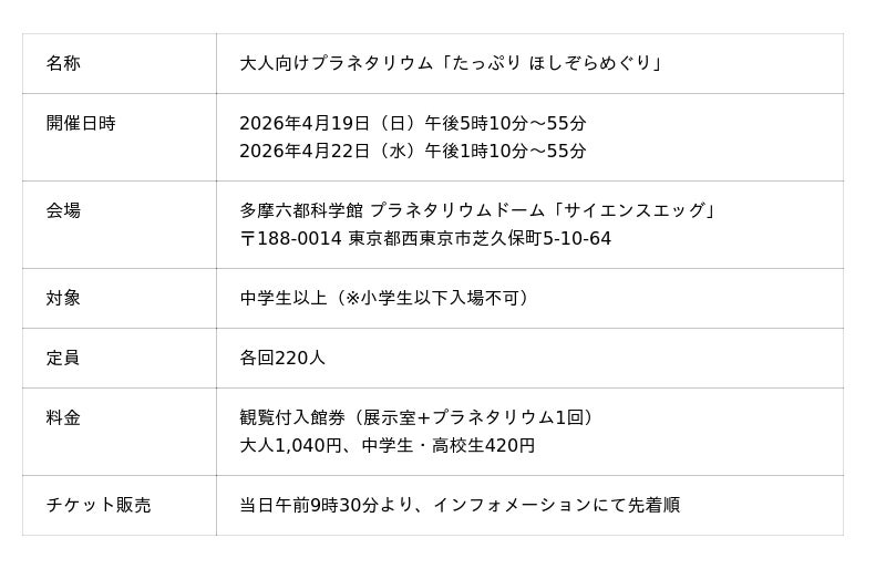 多摩六都科学館(東京都西東京市、館長:高柳雄一。以下、当館)では中学生以上を対象とした「大人向けプラネタリウム」を投影しています。