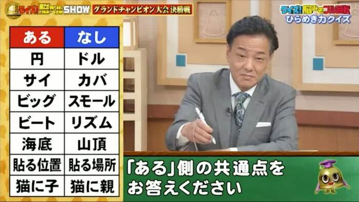 次は、あるなしクイズ。次の単語の「ある」側の共通点を答えてください。
