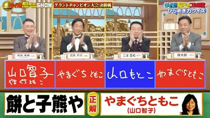 正解は「やまぐちともこ(山口智子)」。西尾さん、安田さん、鼓太郎さんが正解。
