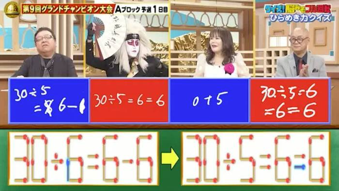 正解はまず、左の式の「6」から1本を動かし「5」にします。その1本を右の式の「-」に足して「=」にします。そうすれば「30÷5=6=6」となります。氏神さんと田山さんの2人が正解。
