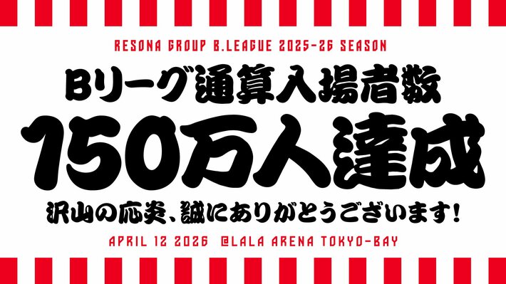 千葉ジェッツでは2026年4月12日(日)vs.滋賀レイクス戦にて、B1リーグ戦(レギュラーシーズンのみの入場者計算で公式記録として)通算入場者数150万人を突破したことをお知らせいたします。こちらはBリーグ最速での記録達成となります。