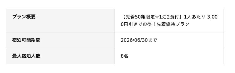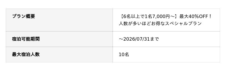現在、先着50組限定で1名あたり3,000円引きの優待キャンペーンを実施中。最大8名まで宿泊可能な「デラックス6ベッド」の客室は、気心の知れた仲間との温泉旅行にぴったりです。