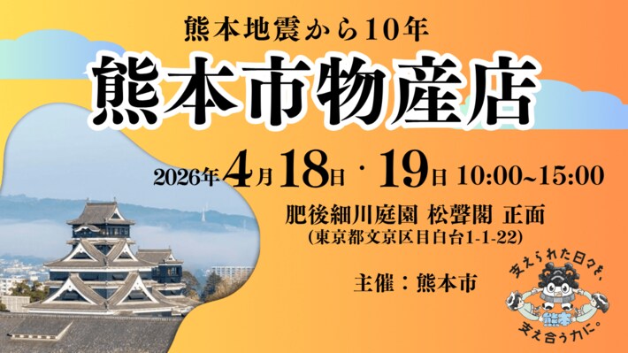 熊本市(市長:大西 一史)は、令和8年(2026年)4月18日(土)・19日(日)の2日間、東京都文京区目白台にある肥後細川庭園にて、熊本地震から10年の節目とした企画『熊本市物産店』を開催いたします。平成28年(2016年)熊本地震から10年、全国の皆さまの支援により、熊本は力強く復興いたしました。この経験と教訓や熊本と文京区の歴史や文化の繋がりを伝えるパネル展をはじめ、熊本市が誇るうまかもん(特産品)の販売を実施いたします。