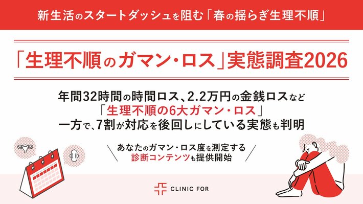 そこでクリニックフォアでは、自身の生理不順による損失を把握し、適切なケアを検討するきっかけを提供する「生理不順のガマン・ロス度診断」のサービス提供を開始します。