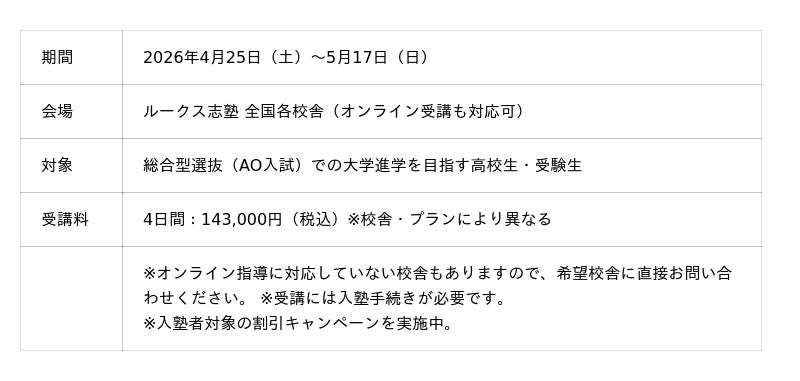 ルークス志塾(本社:東京都渋谷区、代表取締役:嶺井祐輝)は、2026年4月25日(土)から5月17日(日)にかけて、総合型選抜(AO入試)合格を目指す高校生・受験生を対象とした「GW講習」を全国の校舎にて開催いたします。