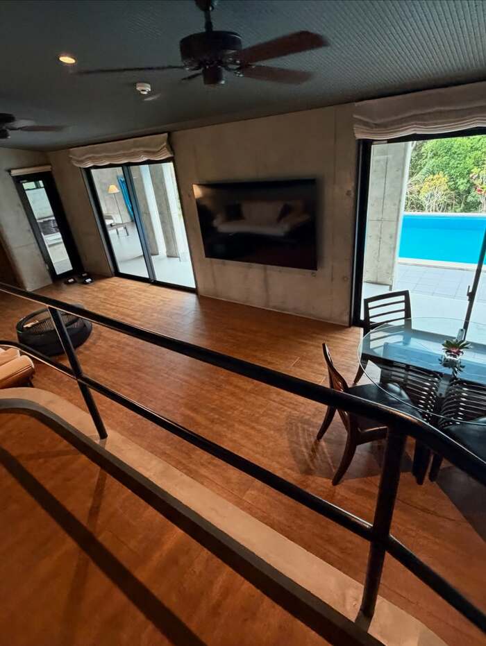 ガラステーブルが印象的な黒いテーブルセットなど、高級感のある家具が設置されており、そして一段上がった奥には、ベッドが広がっているようです。