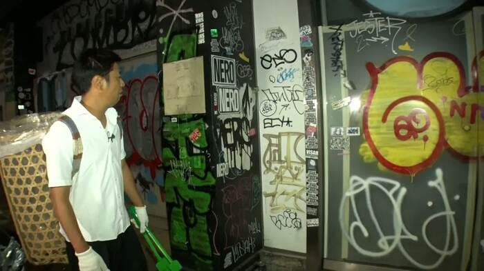 3ヵ月前、彼らが朝までゴミを拾い続けたこの街で、新たに立ちふさがった敵が「汚されまくった壁」です。今回は、渋谷の至るところにある、落書きやステッカーを12時間かけてきれいにします。