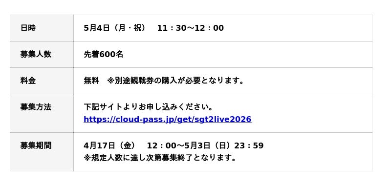 今年も、ファンの皆様により近い距離でライブをお楽しみいただけるよう、ホームストレート上に“特設アリーナエリア”を開設します。サーキットのど真ん中で体感する音楽ライブと、これから始まるレースへの高揚感が重なり合う、スタート直前、この瞬間にしか味わえない特別な体験を創出します。 ● 募集概要