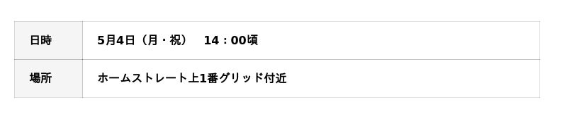 フリープラクティス・予選 5月3日(日)ウォームアップ・決勝 5月4日(月・祝)