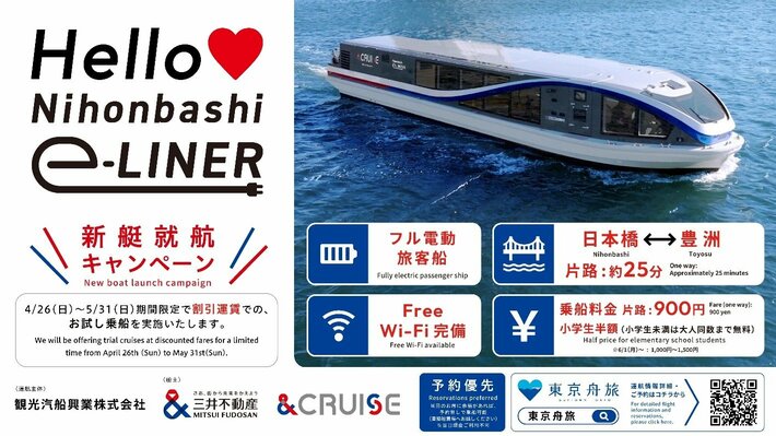 三井不動産株式会社(本社:東京都中央区、代表取締役社長:植田俊、以下「三井不動産」)は、舟運プロジェクト『&CRUISE』を2026年1月より始動しました。今般、国内初の民間企業によるフル電動旅客船の定期航路である「Nihonbashi e-LINER」が、日本橋・豊洲間で、2026年4月26日(日)より観光汽船興業株式会社(本社:東京都中央区、代表取締役:村岡夏子、以下「観光汽船興業」)を運航主体として、定期運航を開始することをお知らせいたします。