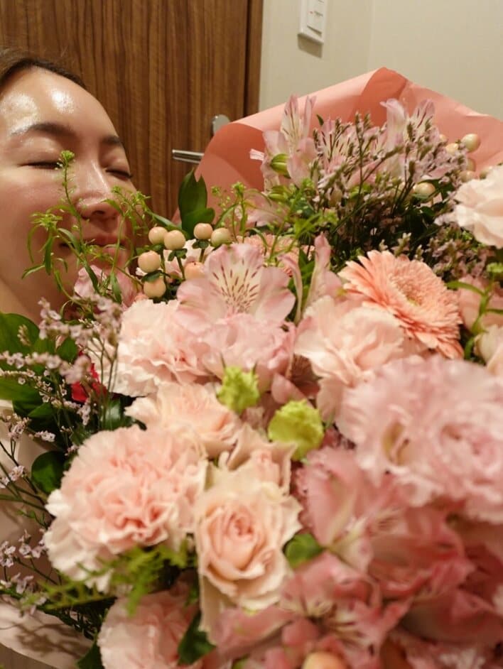 さらに、淡いピンクのガーベラやバラなどが束ねられた華やかな花束を前に、目を閉じて香りを楽しむ様子も公開。「カトちゃんと出会い17年 カトちゃん&親友達に連日祝って頂き感謝感激です」と長年連れ添う夫への想いや周囲への感謝をつづりました。