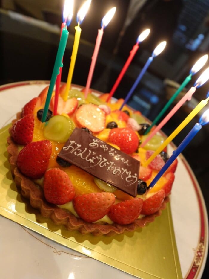 フルーツがたっぷり乗った豪華なバースデーケーキには、大粒のイチゴやマスカット、ブルーベリーがふんだんにトッピングされ、中央には「あやなちゃん おたんじょうびおめでとう」と書かれたチョコプレートが飾られています。
