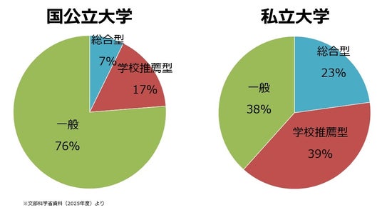入試の多様化が進む中、総合型選抜・学校推薦型選抜は年々拡大し、今や大学入学者に占める割合は国公立大で25%近くまで増え、私立大では60%以上となっています。