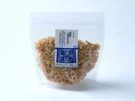 一度食べたらとりこになる、老舗海産物問屋が作った本気の天かす。イカと魚のすり身を使っているため、一般的な天かすと比べて、風味の豊かさが圧倒的です。うどんやお好み焼き、野菜炒めにかけたり、冷奴やサラダにかけたり、そのままおやつにしたりと、使いやすい一品です。