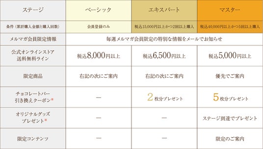 - ステージ判定: 過去の積算ご購入金額に基づき決定※特典内容は、今後さらなる拡充を予定しております。