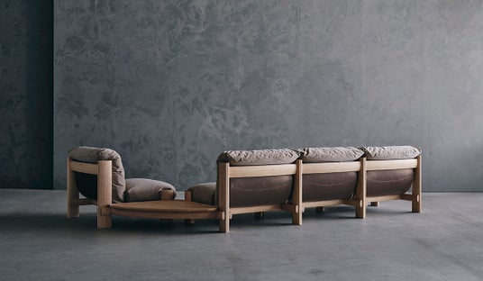 クッションを支える本革は、自然のシボを活かしたセミアニリン仕上げ。柔らかな質感と力強いフレームの対比が、洗練された印象を引き立てます。背面は曲面で構成され光を受けて革と木の輪郭が緩やかに変化する、豊かな表情を描きます。
