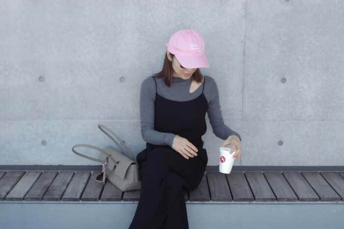 肩にスリットが入ったグレーのシャツに黒のキャミソールワンピースを合わせたコーデでは、手に紙コップを持ってベンチに座っています。華やかなピンクのキャップがアクセントに。
