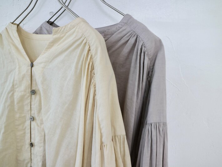 チャイ染め染めブラウスたっぷりと施されたギャザーがやわらかな陰影を生み、ふんわりとした立体感のあるシルエットに。身体のラインを包み込むようなゆとりのあるデザインは、リラックスした着心地でありながら、どこか上品な印象も感じさせてくれます。軽やかな素材感が動くたびにやさしく揺れ、日常のスタイリングにさりげない華やかさをプラスします。