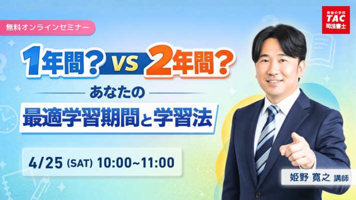 この時期は1年後と2年後のどちらの試験を目指すか迷いどころです。実際には、学習環境や性格、予備知識などによって目指すべき年度は異なるでしょう。本セミナーでは、司法書士試験と受験生心理を知り尽くした姫野講師が、司法書士試験の特性や実務などをお話しした上で、各学習期間(1年間・2年間)のメリット・デメリットを比較し、人それぞれの最適学習期間と学習法を示します。