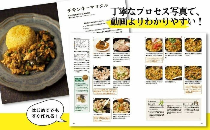 そういう意味では、工程数の多いカレーのレシピが続いた後に突然工程数が超少ないクイックチキンカレーを挟んだり、バスマティライスを鍋で炊く方法も紹介しつつ、炊飯器で炊くレシピもあったり。本の中で、ところどころに踊り場のようなものを設けていて、「ついてこいよ、脱落するなよ」みたいな作りを意識しました(笑)。