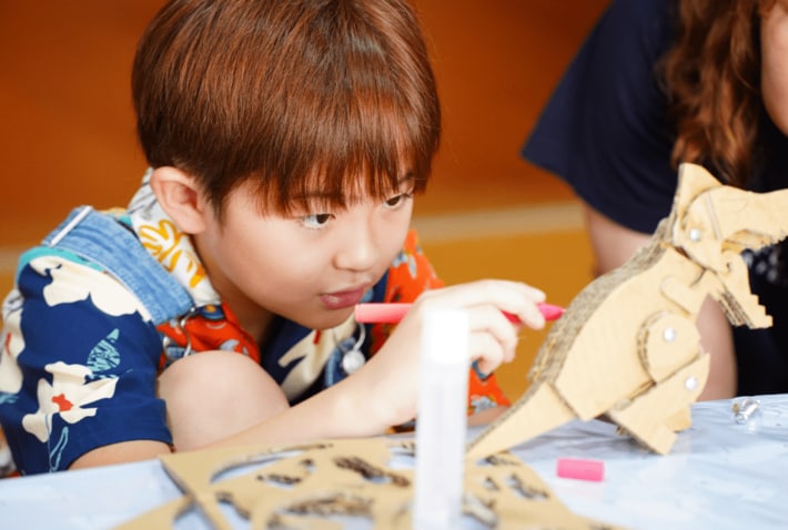 段ボールという身近な素材を使い、恐竜を組み立てる体験を通じて、