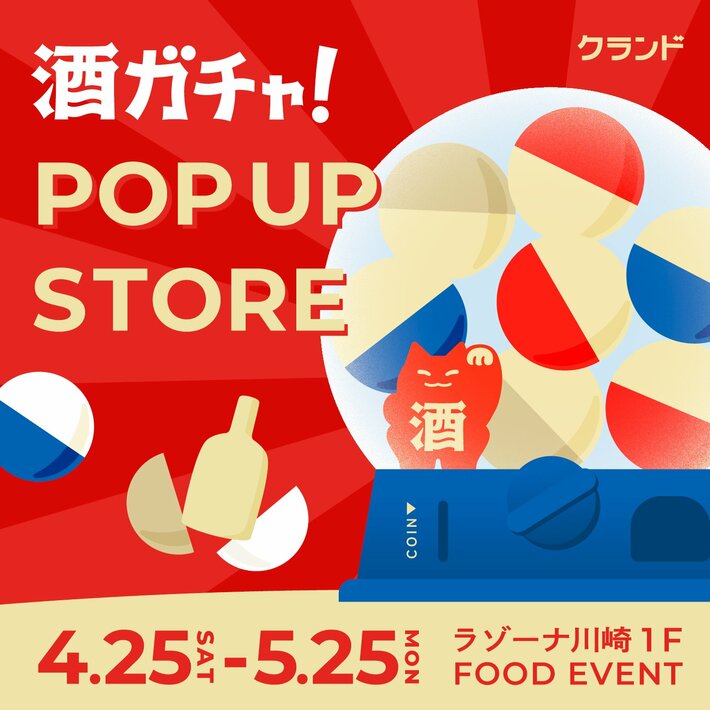 KURAND株式会社(本社:東京都足立区、代表取締役:荻原恭朗)は、弊社が運営するオンライン酒屋「クランド」のポップアップストア「クランド 酒ガチャ POP UP STORE」を、2026年4月25日(土)~5月25日(月)の期間限定でラゾーナ川崎プラザ 1F FOOD EVENT(神奈川県川崎市)にて開催します。