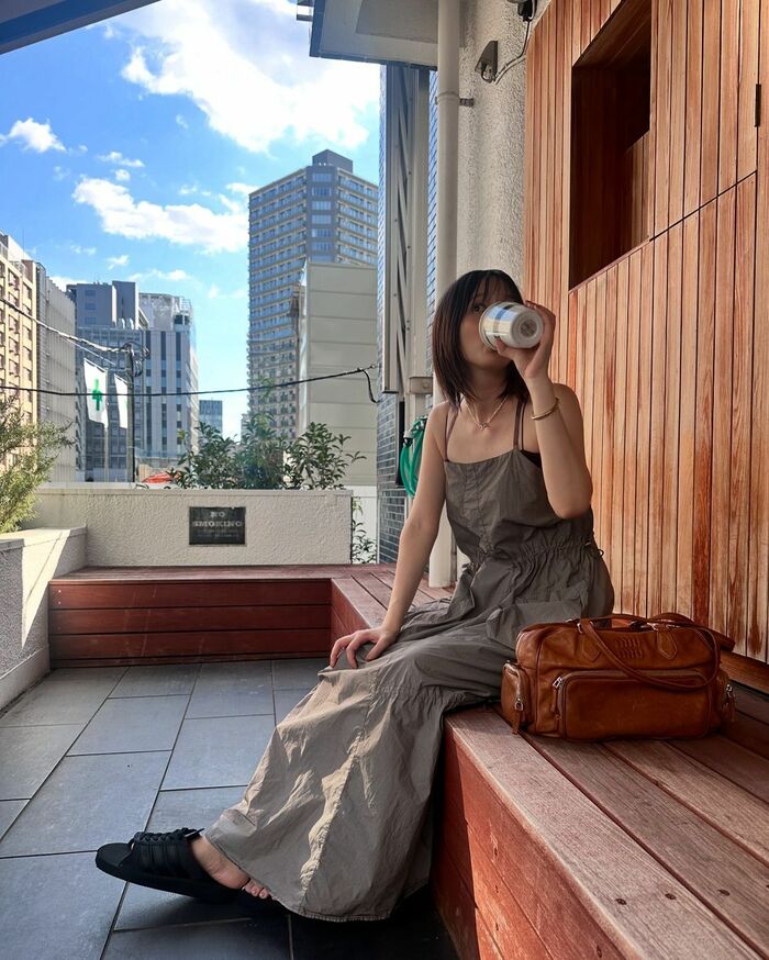 その他にも、木のベンチに腰掛けドリンクを飲む“休日らしさ”溢れるショットも。