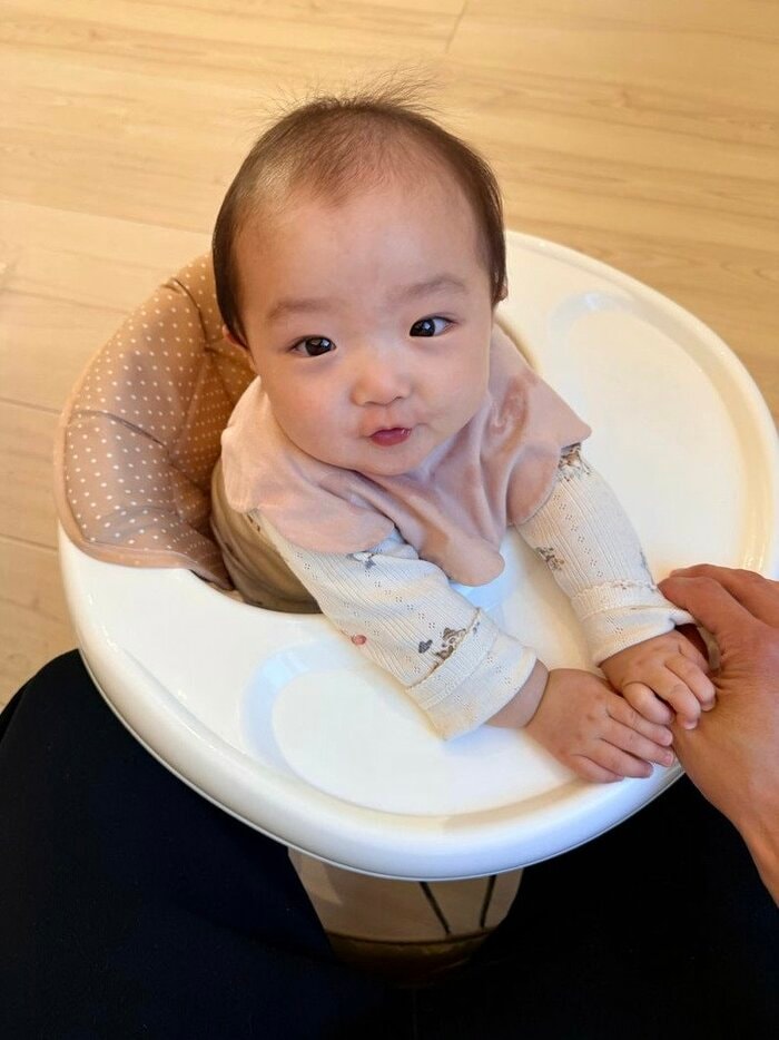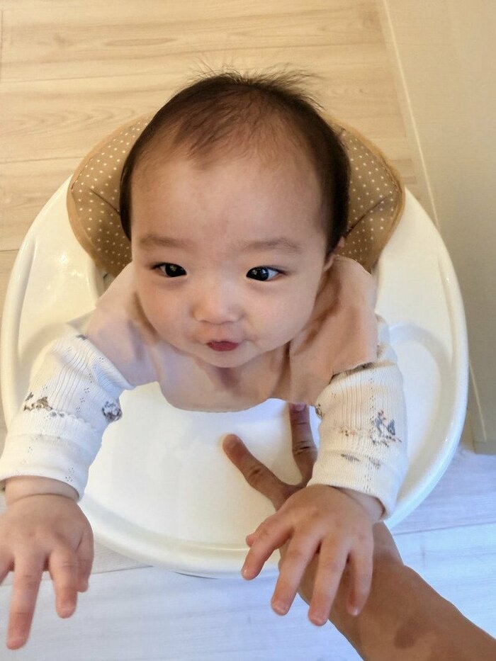 小さな両手で手をつかみ、再会の喜びを全身で表現する姿からは、大好きなパパへの愛情があふれています。無邪気に見上げるキラキラとした瞳に、思わず心が温まるワンシーンです。