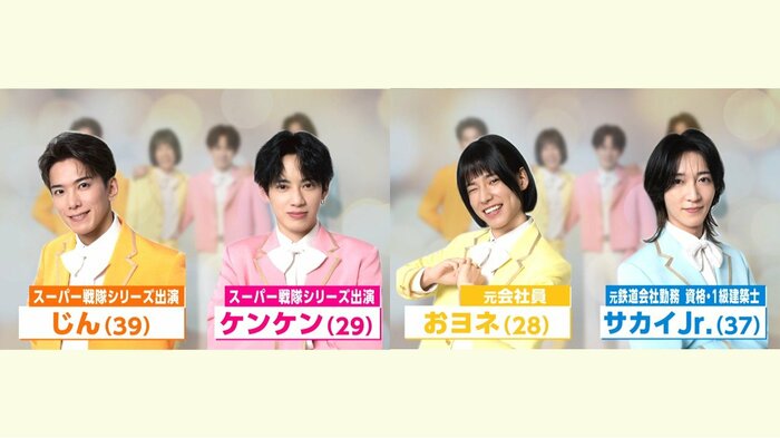 元戦隊ヒーローで俳優出身の「じん」さん(39)と「ケンケン」さん(29)。そして、元会社員としてキャリアを積んできた「おヨネ」さん(28)と「サカイJr.」さん(37)の異色のメンバー構成。