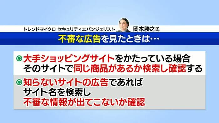 岡本さんによると「SNSの広告などにも偽サイトに誘導するものが混ざっていて、購入したつもりなのに商品が届かないなどの被害がある」のだそうで、「大手ショッピングサイトで同じ商品が出ているか検索してみる」「ショッピングサイトの名前を検索してみる」などの対策で被害を予防することができるそうです。