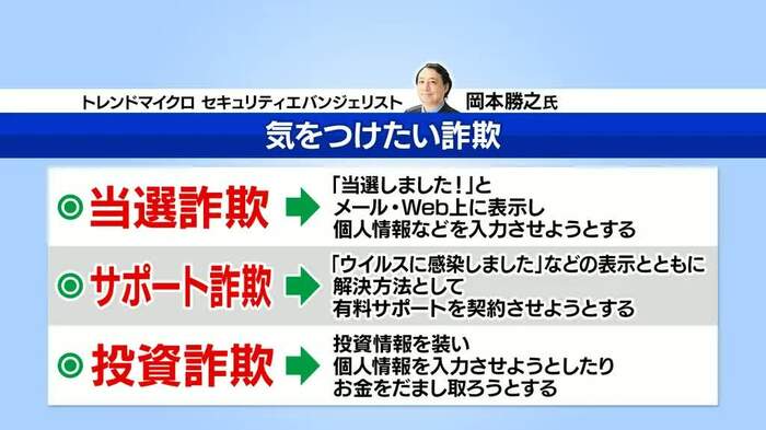 気をつけたいフィッシング詐欺には、当選詐欺、サポート詐欺、投資詐欺といったものもあります。