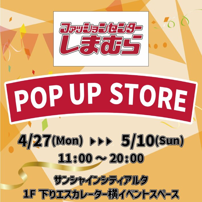 4/27(月)~ 5/10(日)までの期間中、池袋サンシャインシティアルタにて、ファッションセンターしまむらの期間限定POP UP STOREを出店します。婦人服・子供服を中心に、キャラクターやインフルエンサー企画などの人気商品を販売します。インフルエンサーの来店イベントも予定しております。