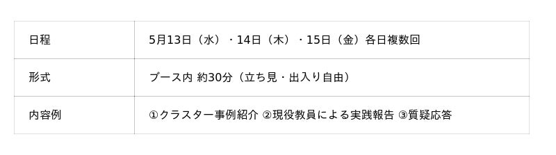 各日ブース内で教員登壇セミナーを実施。「実際に授業でどう運営したか」「生徒の反応は?」など現場の声を直接お届けします。