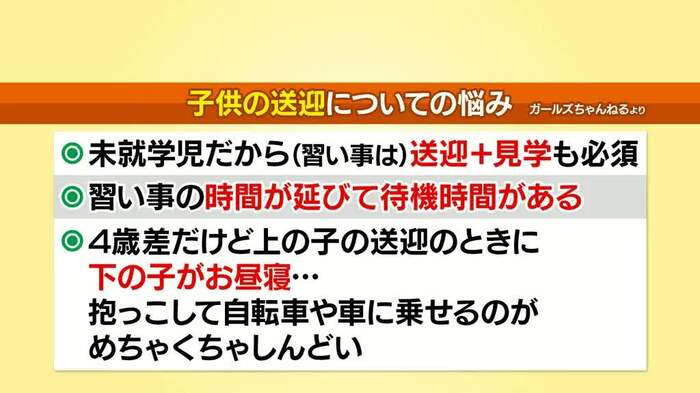 番組では、「送迎だけでなく見学の時間も負担」「上の子の送迎中に下の子が昼寝をしてしまい、しんどい」などの「送迎あるある」も紹介されました。